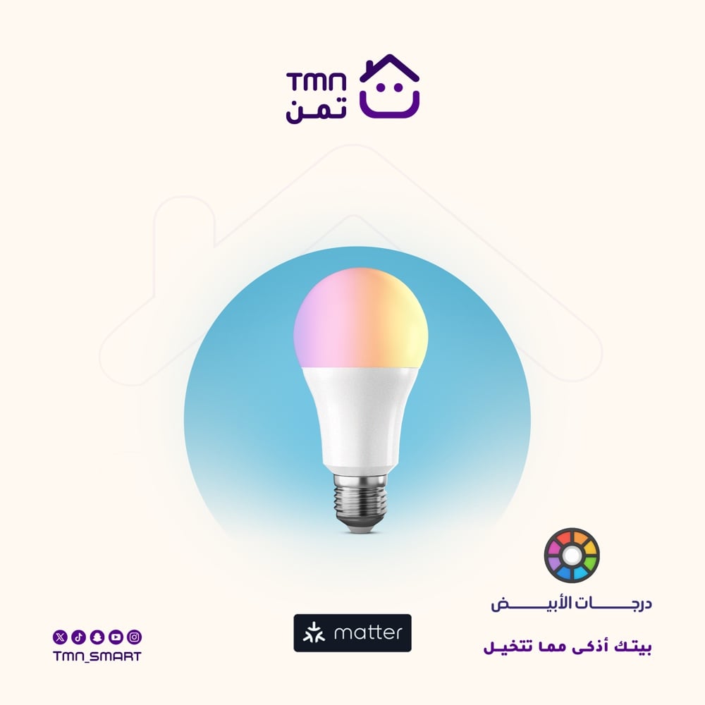 لمبة تمن الذكية متعددة الألوان RGB تعمل بتقنية Matter العالمية، تشتغل مباشرة على شبكة البيت عبر Wi-Fi وتخليك تربطها مع أجهزة من شركات مختلفة بكل سلاسة. تجربة موحّدة، تحكم أسهل، وبيت أذكى بدون تعقيد.