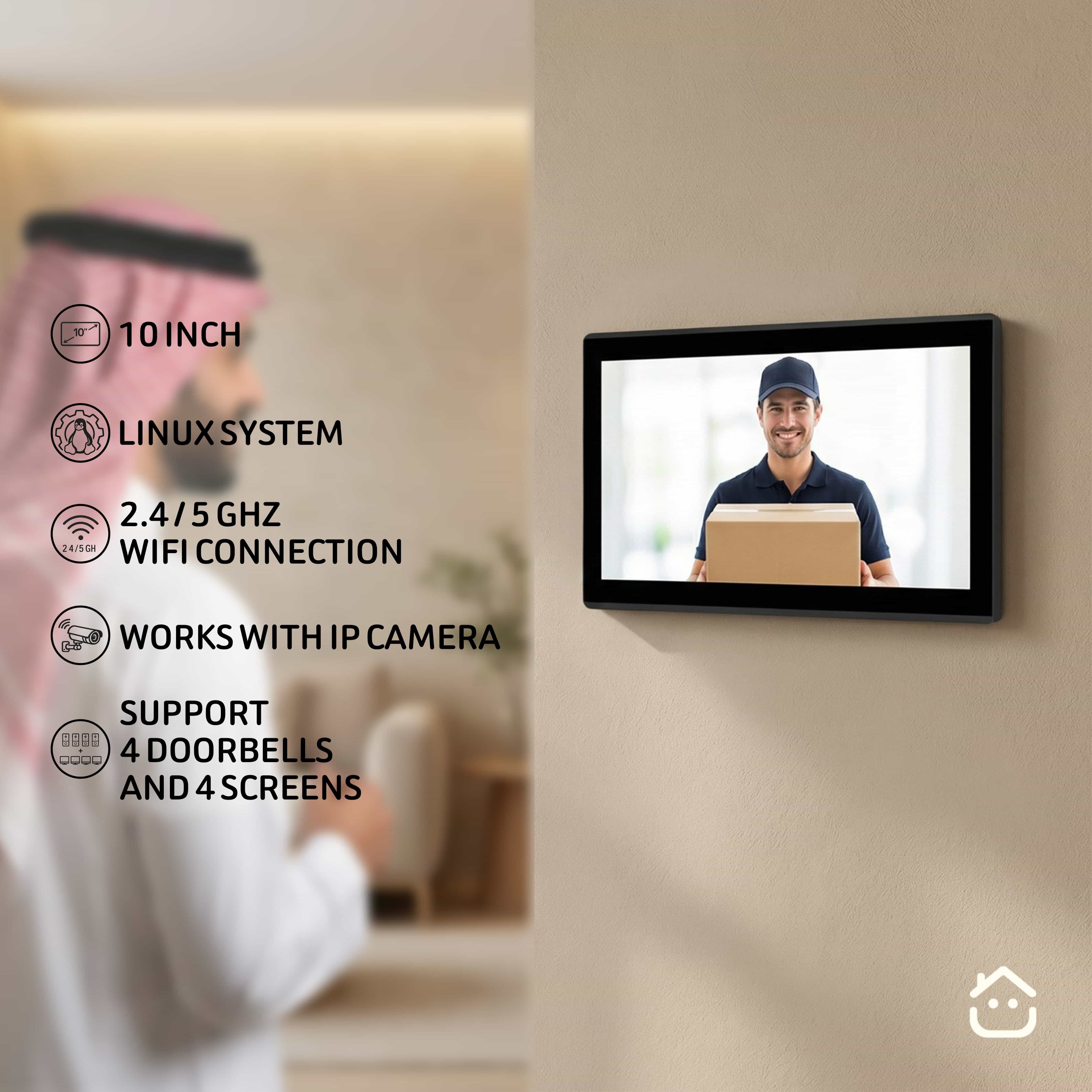 مين عند الباب؟ مشاهدة مباشرة بالصوت والصورة عبر الشاشة الداخلية ١٠ انش أو عبر تطبقنا الذكي.
