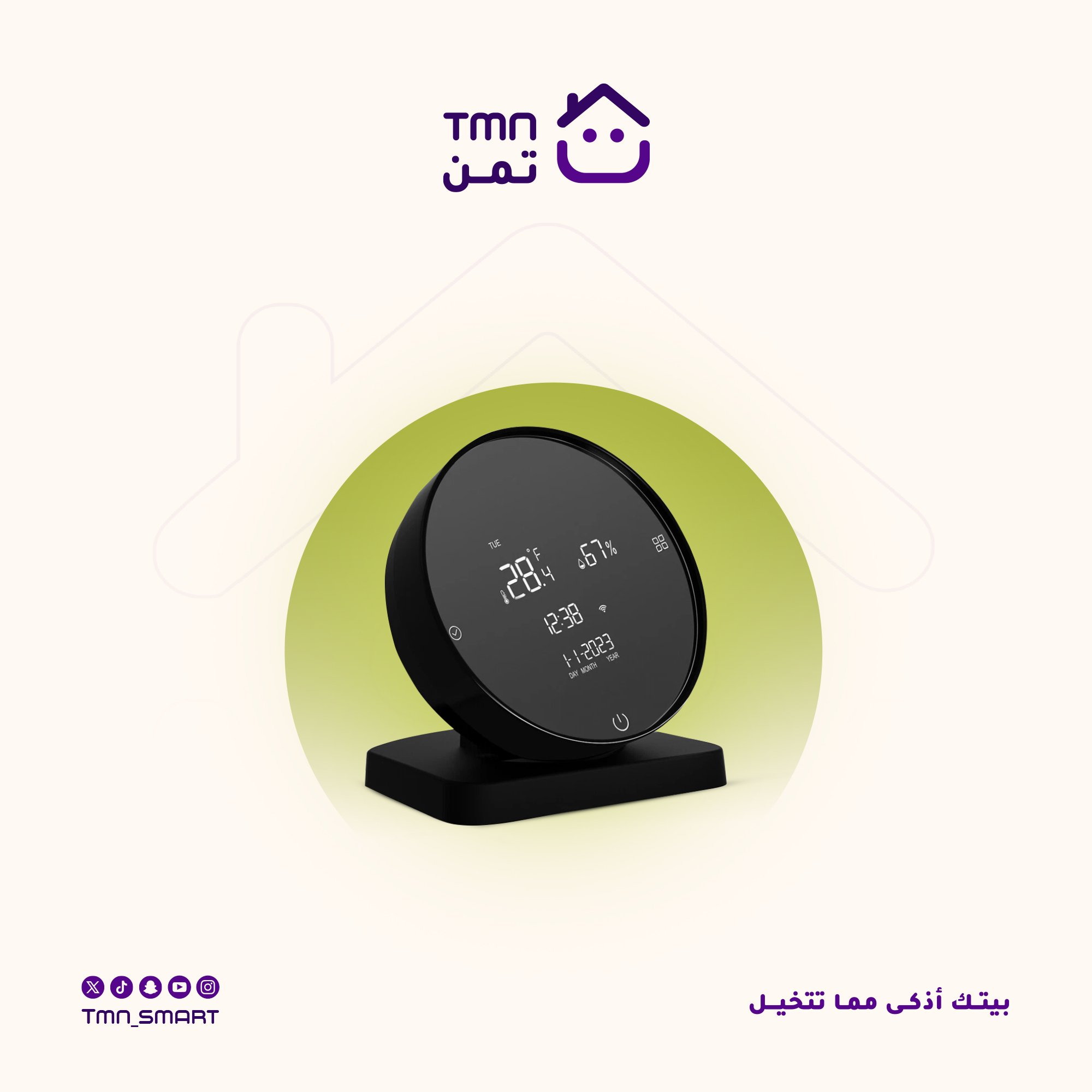 مو بس يتحكم بأجهزتك—بعد يقيس الحرارة والرطوبة لحظة بلحظة، ويضبط لك الأجواء بذكاء من داخل تطبيق TMN.